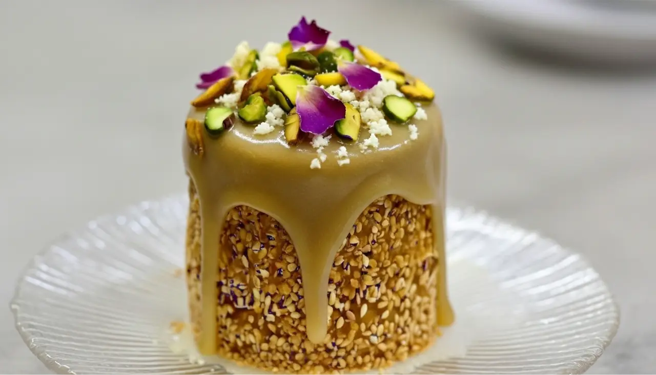 كيكة قرص عقيلي اللذيذة مغطاه بصوص طحينه تعلوه طبقة من الفستق المطحون والرهش