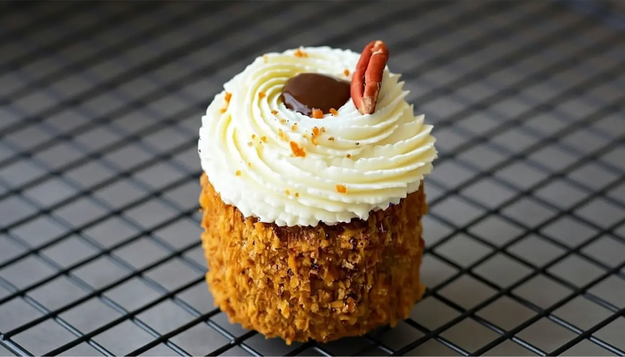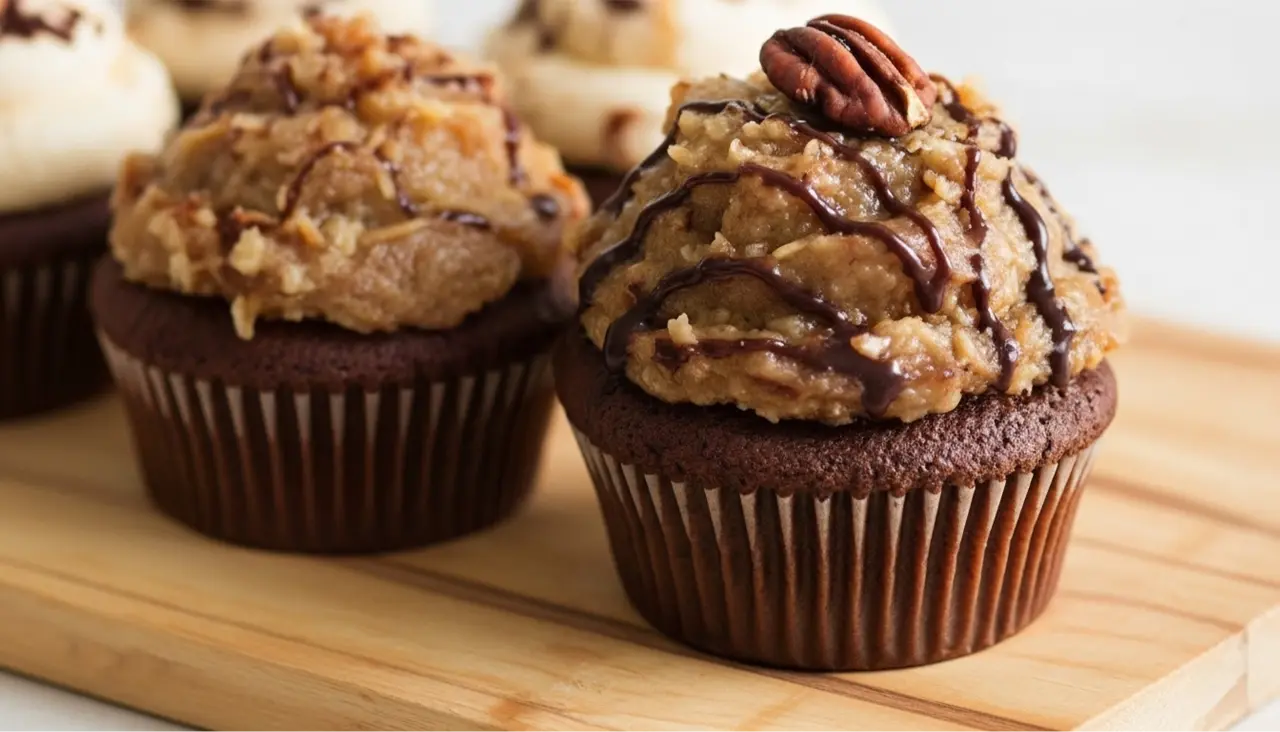 كب كيك الشوكوالتة الغنية مغطاة بطبقة من الكراميل وشرائح جوز الهند المحلي وجوز البقان